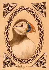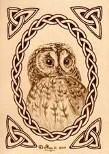 The wildlife portrait designs depicted within a celtic knot oval border have each been carried out on a miniature ACEO size 2.5" x 3.5" piece of quality vegetable tanned leather. (For more information on the term ACEO, please visit the January 2012 News page). In some instances the usual monochrome pyrography has been enhanced with lightfast artist quality coloured inks to enhance realism. Supplied in a clear protective plastic sleeve accompanied by a personally signed and titled Certificate of Authenticity. COMMISSION PRICE: £18.00 GPB